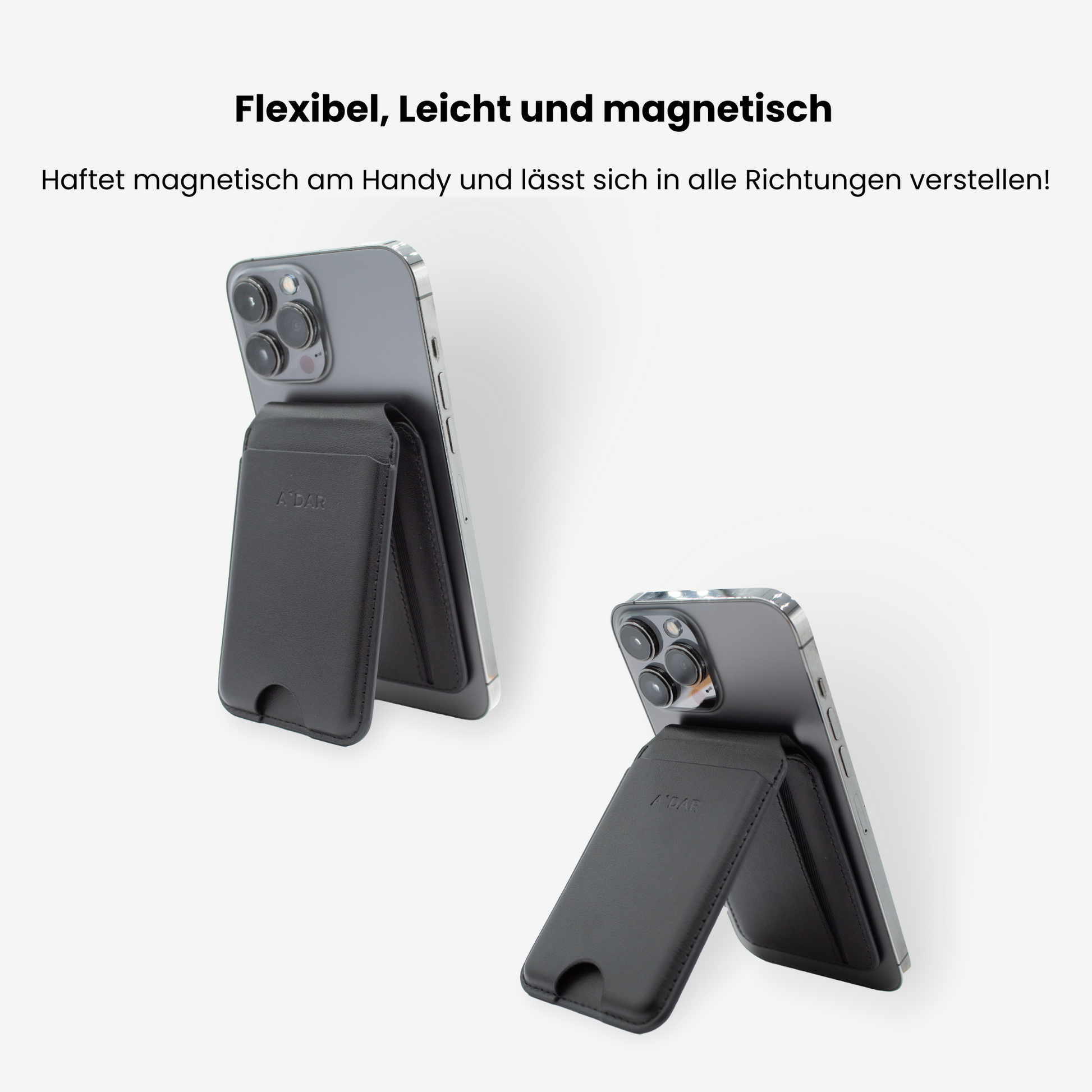 Halb so groß wie andere Geldbörsen und dabei unglaublich komfortabel zu tragen. Das AdarWallet haftet magnetisch an deinem iPhone und bietet Platz für bis zu 7 Karten. Ob du unterwegs bist, eine schnelle Besorgung machst oder dein Smartphone für freihändige Ansichten aufstellst – das AdarWallet ist dein perfekter Begleiter.